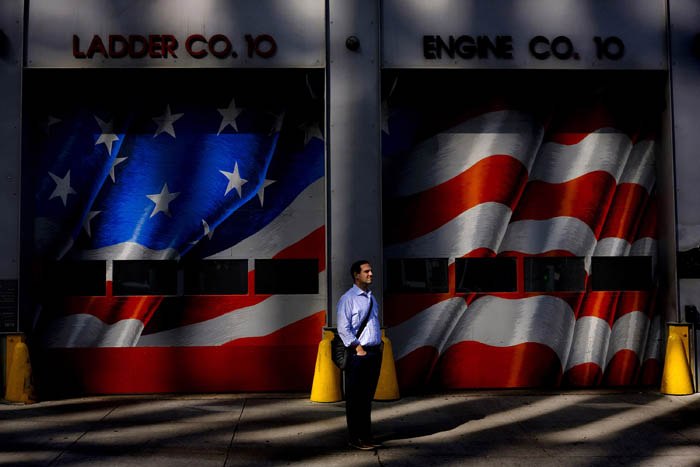 In lower Manhattan a businessman stands in front of FDNY's Engine 10, Ladder 10 while on Liberty St. while looking at the 9/11 Memorial site. 343 Firefighters lost their lives on 9/11, including 4 from that firehouse. Thursday October 10, 2019. New York, NY
