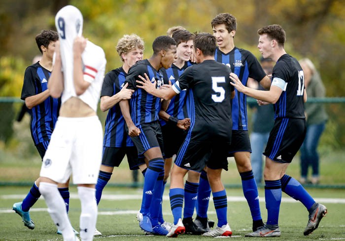 Gill St. Bernard's Micaah Garnette, center, celebrates his goal in the 2nd half guaranteeing their win as Pingry's Will Bugliari covers his face with his jersey in dejection during the Somerset County boys soccer tournament final with Gill St. Bernard's vs. Pingry with the game held at the Torpey Athletic Complex. Saturday October 26, 2019. Bridgewater, NJ