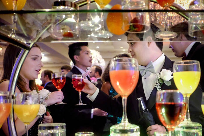 A pair of students toast themselves with non-alcoholic drinks during the Ramsey High School 2019 prom at the Rockleigh Country Club. Friday April 26, 2019. Rockleigh, New Jersey, USA