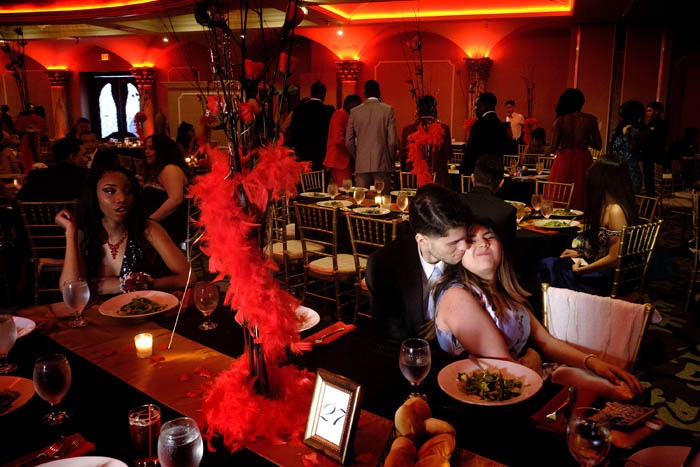 A romantic couple relaxes at their table as others get their food at the 2019 Linden High School prom held at the Grand Marquis. Thursday May 23, 2019. Old Bridge, New Jersey, USA