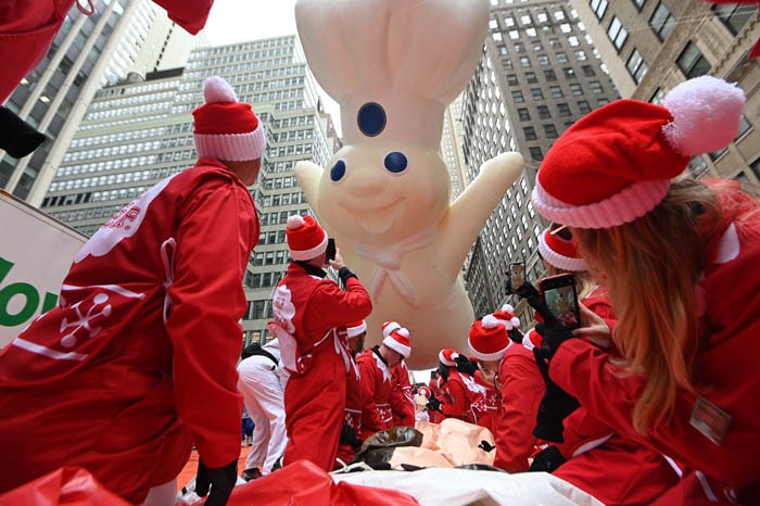 The Pillsbury Dough Boy balloon is brought to earth for deflation after the Macy's Thanksgiving Parade