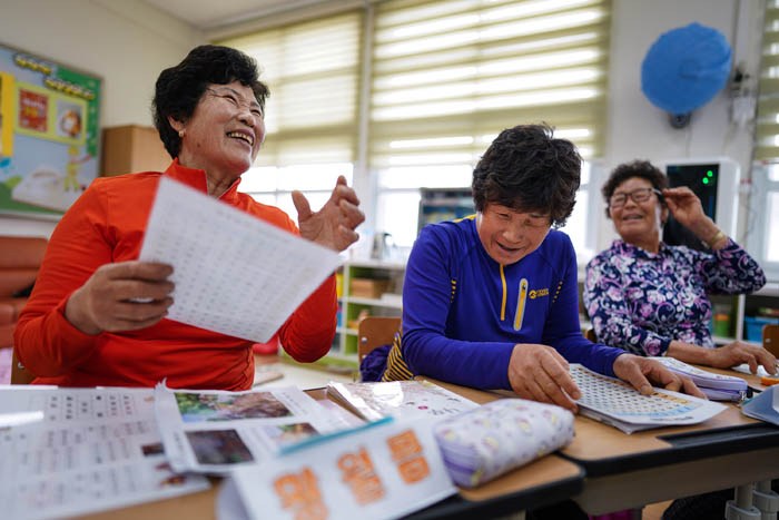 Apr. 11th, 2019, Gangjin, South Korea-Hwang Wol-geum, 70, left, Kim Mae-ye, 64, center, and Park Jong-sim, 75, studying the combination of Korean Alphabet, the chart on her hand, at Daegu Elementary School. These grandmothers are learning Korean and admitted to school for the first time in their lives.