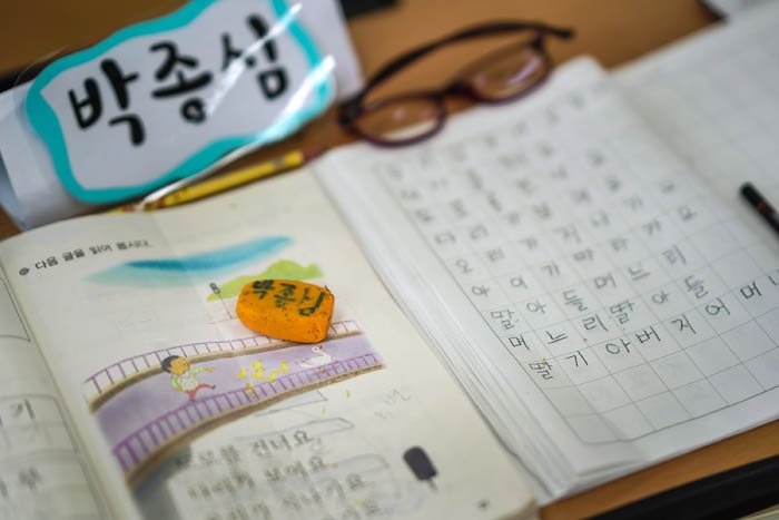 Apr. 11th, 2019, Gangjin, South Korea-Eraser of Park Jong-sim, 75, which has her name on it in the classroom as she and other grandmothers learned Korean at Daegu Elementary School. These grandmothers are learning Korean and admitted to school for the first time in their lives.