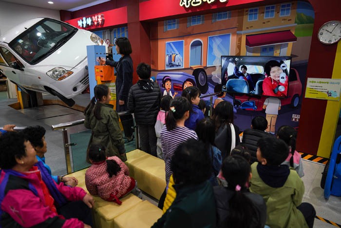 Apr. 12th, 2019, Gangjin, South Korea- Hwang Wol-geum, 70, and Kim Mae-ye, 64, purple jacket, seen in the monitor that shows them riding the turning car, to experience a simulated accident and effects of seat belt, that turns around 360 degree during a field trip to Traffic Safety Experience Center at Jeollanamdo Traffic Education Institute.