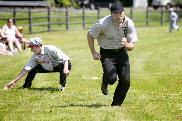 Enterprise Club of New Bridge's Matt Watkins sprints home down the third base line to score a tally 'run' as Kyle Vanderbeck of the Flemington Neshanocks fields the ball. Saturday July 13, 2019. River Edge, NJ