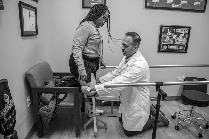 Abe Mathews, a certified prosthetist and orthotist at Progressive Orhtotics & Prosthetics in Alberston takes Amaya Williams' measurements as she gets ready for a new set of legs, Tuesday Jan. 22, 2019.