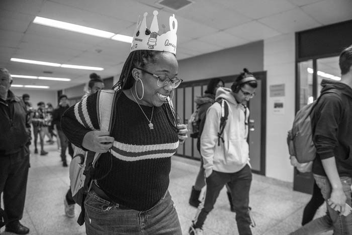 Amaya Williams walks the hallways of Copiague High School where fellow students and teachers celebrated both her birthday and the much talked about three pointer she scored with only a few seconds left in a game against Lindenhurst H.S they night before.