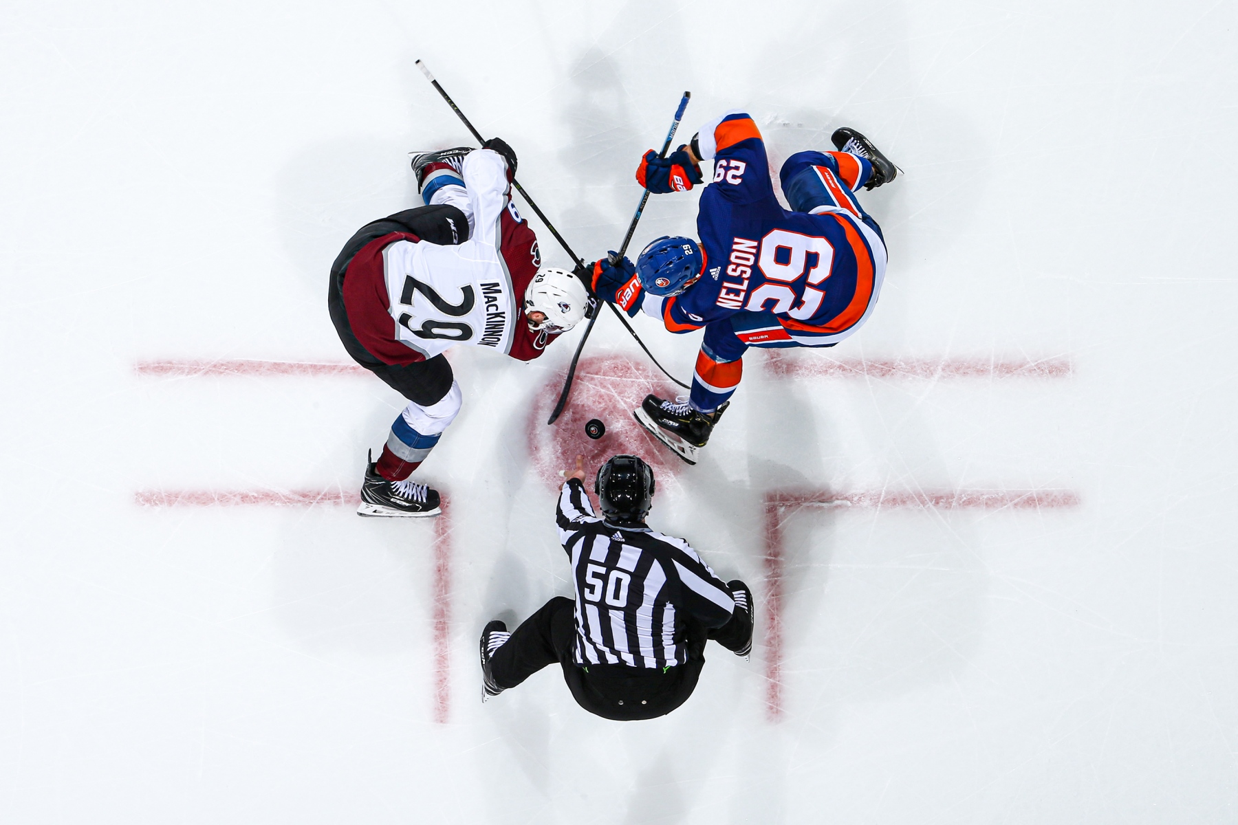 UNIONDALE, NEW YORK - JANUARY 06: Brock Nelson #29 of the New York Islanders faces-off against Nathan MacKinnon #29 of the Colorado Avalanche at NYCB Live's Nassau Coliseum on January 06, 2020 in Uniondale City. New York Islanders defeated the Colorado Avalanche 2-1.