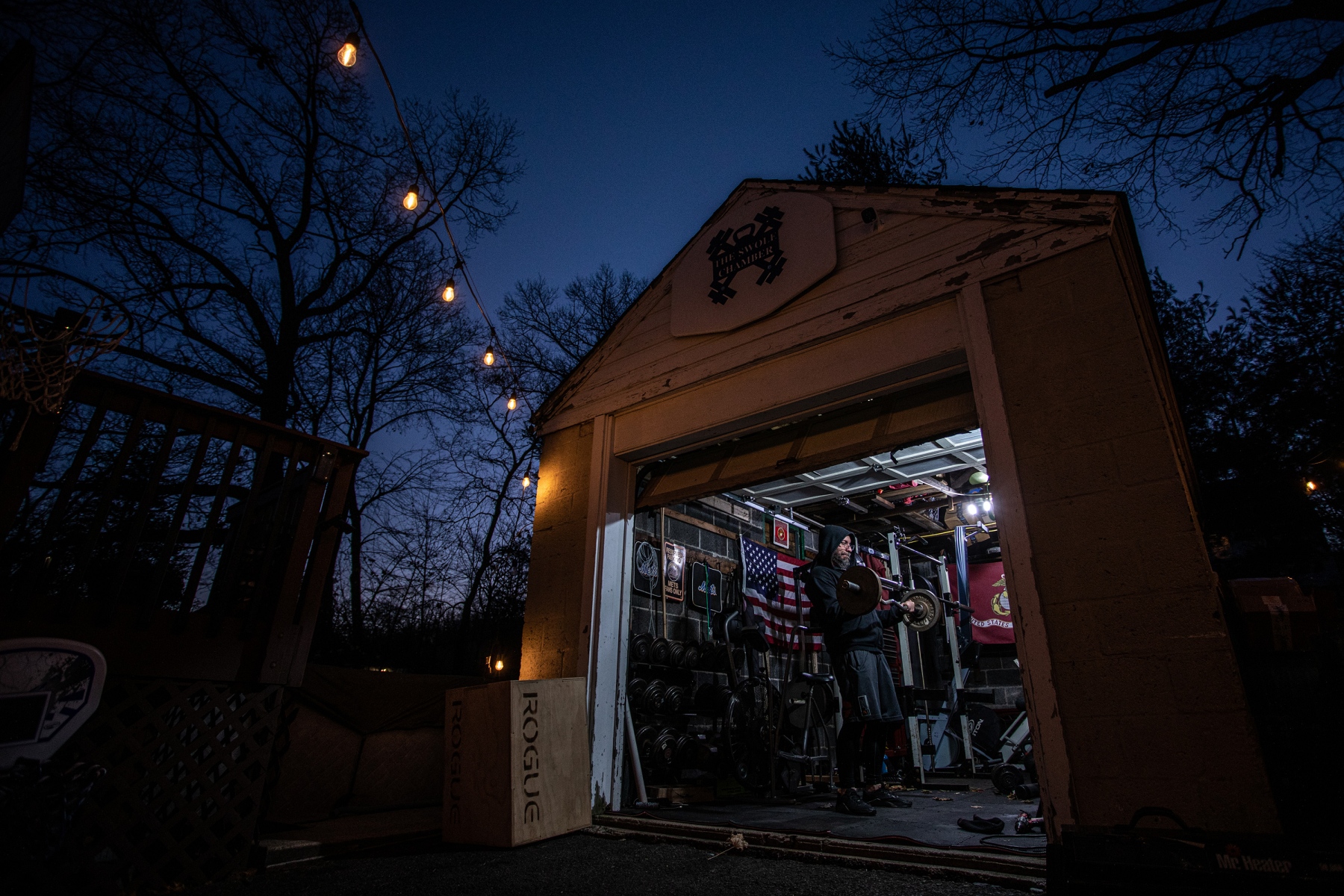 Matt works out in his garage gym on December 6, 2020 in North Haledon, New Jersey. More people have repurposed their garages, spare rooms, backyards, and basements into home gyms since the COVID-19 pandemic hit the United States