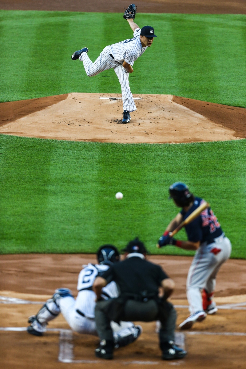 Masahiro Tanaka #19 of the New York Yankees pitches in the first inning against the Boston Red Sox at Yankee Stadium on August 01, 2020 in New York City. New York Yankees defeated the Boston Red Sox 5-2.
