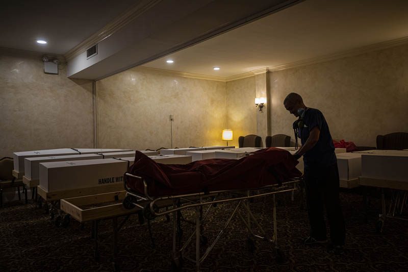 HONORABLE MENTION - Hiroko Masuike – The New York Times - “Coping with Coronavirus” - Omar Rodriguez, a funeral director, moves a body died from coronavirus to a box after picking up from a hospital at Gerard J. Neufeld Funeral Home in Elmhurst, Queens, New York, May 22, 2020. The body will be stored in preparation for burial or cremation in the room with other bodies.
