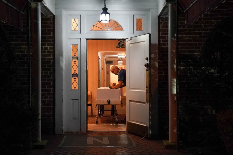 An image of veteran Charles Lowell is projected onto the home he shared with his wife, Alice, for 30 years as she stands at left with her daughter, Susan Kenney, in Hardwick, Mass. Saturday, May 2, 2020. Lowell, a U.S. Air Force veteran and resident of the Soldier’s Home in Holyoke, Mass., died from the COVID-19 virus at the age of 78. Seeking to capture moments of private mourning at a time of global isolation, the photographer used a projector to cast large images of veterans on to the homes as their loved ones are struggling to honor them during a lockdown that has sidelined many funeral traditions. David Goldman/Associated Press