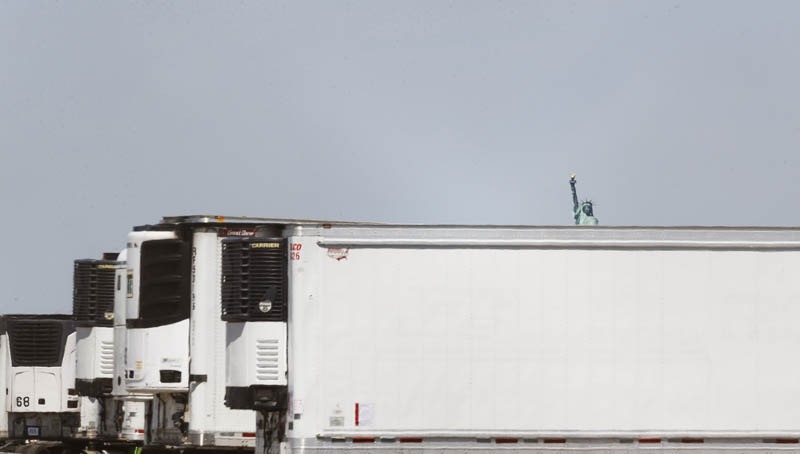 EXHIBIT AWARD - Bryan R. Smith – Independent – “Queens Funeral Home Works To Move Over 30 COVID-19 Victims To Upstate Crematorium” - Refrigeration trucks being used as part of a temporary morgue for victims of COVID-19 are seen with the Statue of Liberty in the background in Brooklyn, New York, USA, on 05 May 2020. New York City, which is still considered to be the epicenter of the coronavirus outbreak is trying to manage the large number of people who have died in the pandemic.