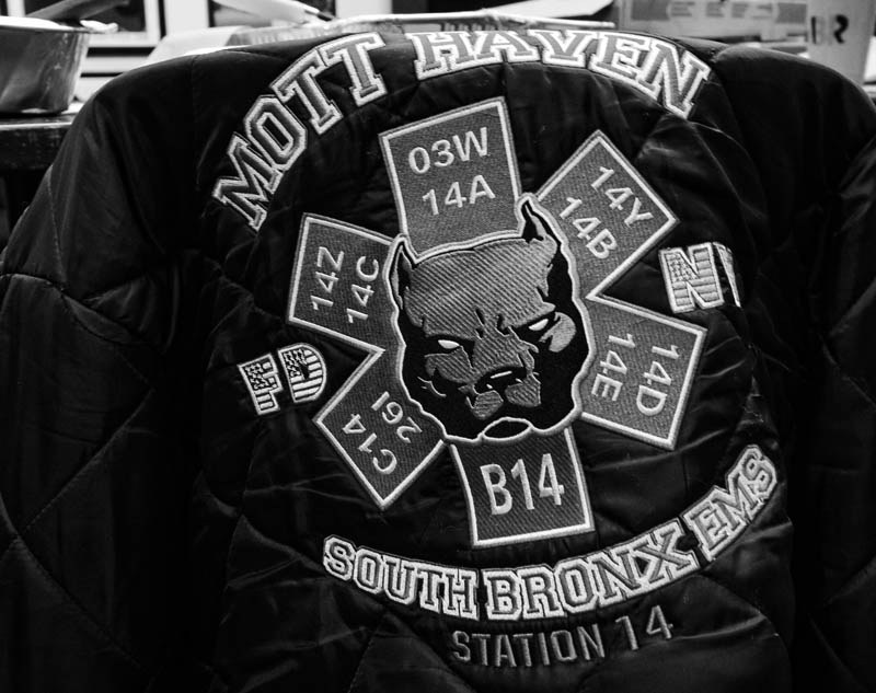EXHIBIT AWARD - Marcus Santos - Independent - “Covid Battleground in the South Bronx” - FDNY Station 14 Jacket. The South Bronx, a heavily minority borough, had the highest per-case fatality rate in NYC during the first wave of the Covid pandemic in NYC. The Bronx has been ground zero for the opioid crisis and then became a coronavirus battleground of the pandemic. 04/08/20. Bronx Lincoln Hospital, New York, New York.