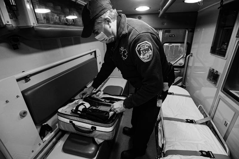 EXHIBIT AWARD - Marcus Santos - Independent - “Covid Battleground in the South Bronx” - Robert Kelly prepares his ambulance for his shift in the South Bronx. The EMT crew of the FDNY Station 14 worked around the clock, with each EMT pulling 14 hr shifts, and staying in hotels to quarantine from their families. Within two weeks in March and April all contracted Covid from their work, and eventually recovered. 04/08/20. Bronx Lincoln Hospital, New York, New York.