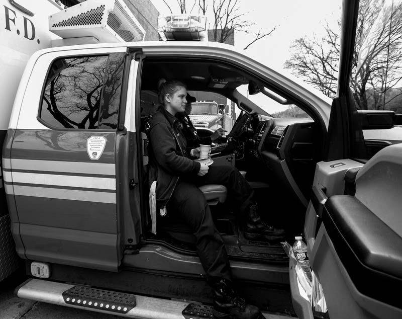 EXHIBIT AWARD - Marcus Santos - Independent - “Covid Battleground in the South Bronx” - Jessica Breier (L) and Robert Kelly (R) sit in the ambulance ready for the next radio call. Brier was returning to work April 8, after recovering from a mild case of Covid-19 she contracted through her work two weeks before. The South Bronx, a heavily minorityborough, has the highest per-case fatality rate in NYC. Bronx has been ground zero for the opioid crisis and then became a coronavirus battleground of the pandemic in New York City. 04/08/20. Bronx Lincoln Hospital, New York, New York.