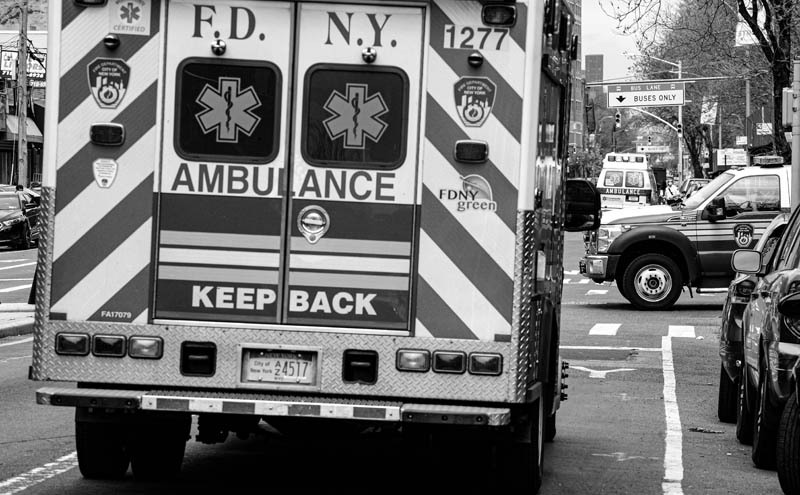 EXHIBIT AWARD - Marcus Santos - Independent - “Covid Battleground in the South Bronx” - Three ambulances parked on the same corner at E. 169th St and Webster Avenue to simultaneously load Covid patients for transport to the hospital. The South Bronx, aheavily minority borough, has the highest per-case fatality rate in NYC. Bronx has been ground zero for the opioid crisis and then became a coronavirus battleground of thepandemic in New York City. 04/15/20. Bronx Lincoln Hospital, New York, New York.
