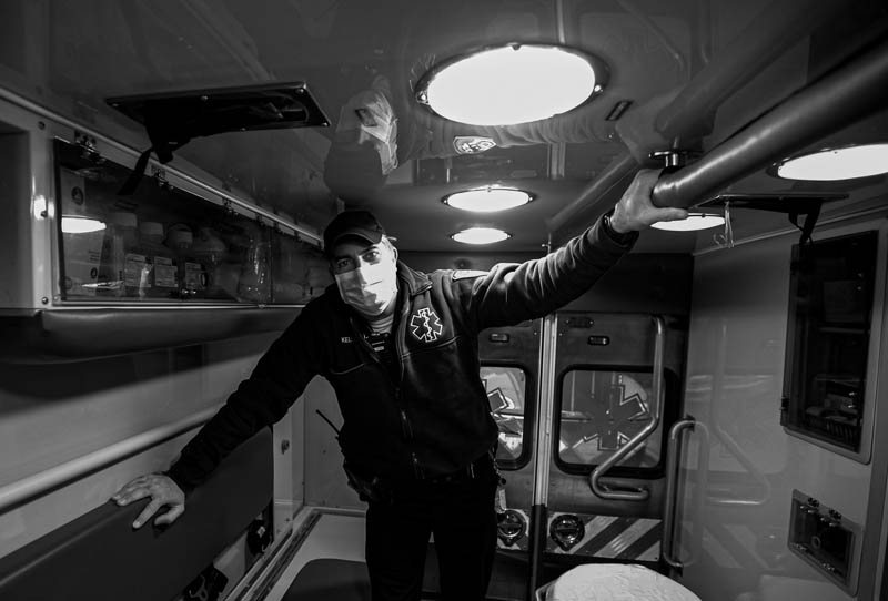 EXHIBIT AWARD - Marcus Santos - Independent - “Covid Battleground in the South Bronx” - Robert Kelly preparing the ambulance for another day in the fight against the coronavirus in the South Bronx. 04/15/20. FDNY Station 14 at Bronx LIncoln Hospital.New York, New York.