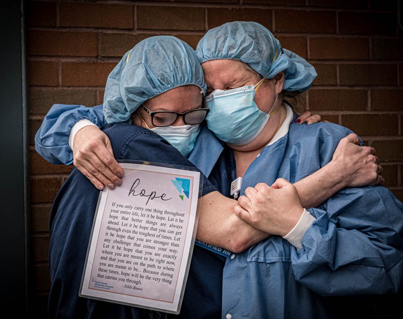 EXHIBIT AWARD - Lee Weissman – Northwell Health - “Covid Unit Life” - Nurses Lisa Swistsun and Abbie Thomas are overcome with emotion as the 1000th Covid patient was discharged from North Shore University Hospital on April 18, 2020.
