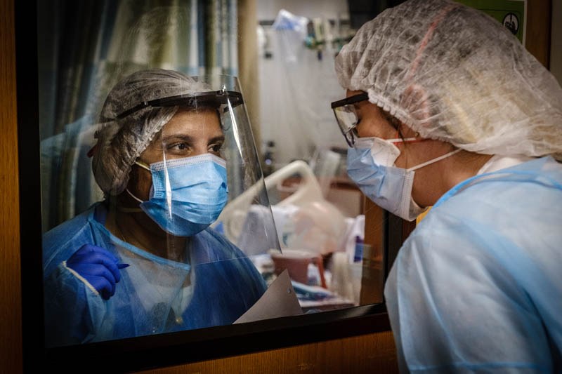 EXHIBIT AWARD - Lee Weissman – Northwell Health - “Covid Unit Life” - A nurse inside a patients room infected with Covid 19 communicates through glass with another nurse. In order to protect the outer area, nurses often ask other nurses for supplies as needed. In the Covid unit at North Shore University Hospital on November 11, 2020.