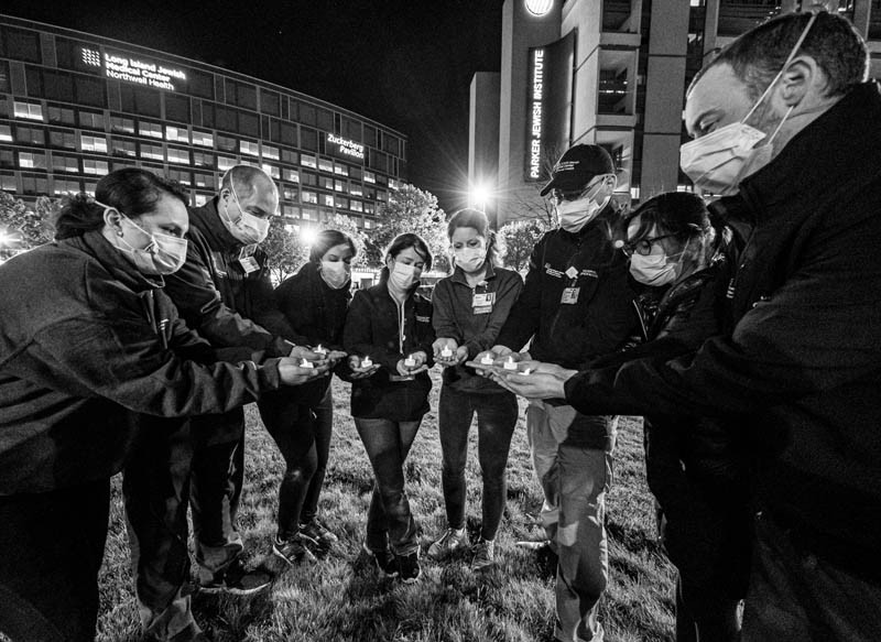EXHIBIT AWARD - Lee Weissman – Northwell Health - “Covid Unit Life” - Staff members from Long Island Jewish Medical Center come together after a candlelight walk to remember those that had perished nationwide from Covid 19 on May 4, 2020.Member 332