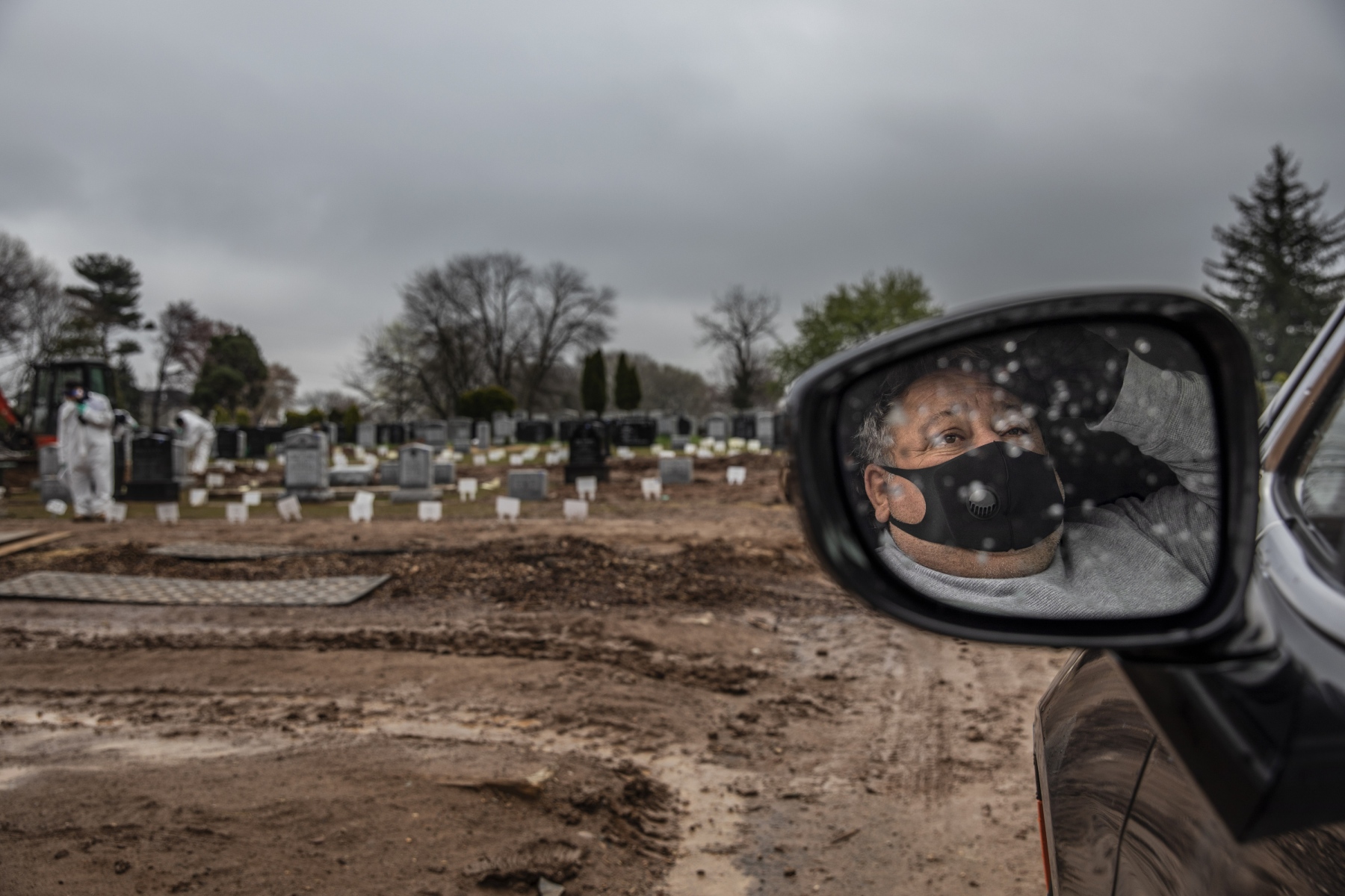 EXHIBIT AWARD - David Goldman – The Associated Press – “Virus Burial” - Michael Tokar can only observe from his car as his father, David Tokar, is buried at Mount Richmond Cemetery in the Staten Island borough of New York, Wednesday, April 8, 2020. Tokar’s father had a cough and fever and a home health aide got him to the hospital. Two days later, he was dead, with the coronavirus listed as the cause.