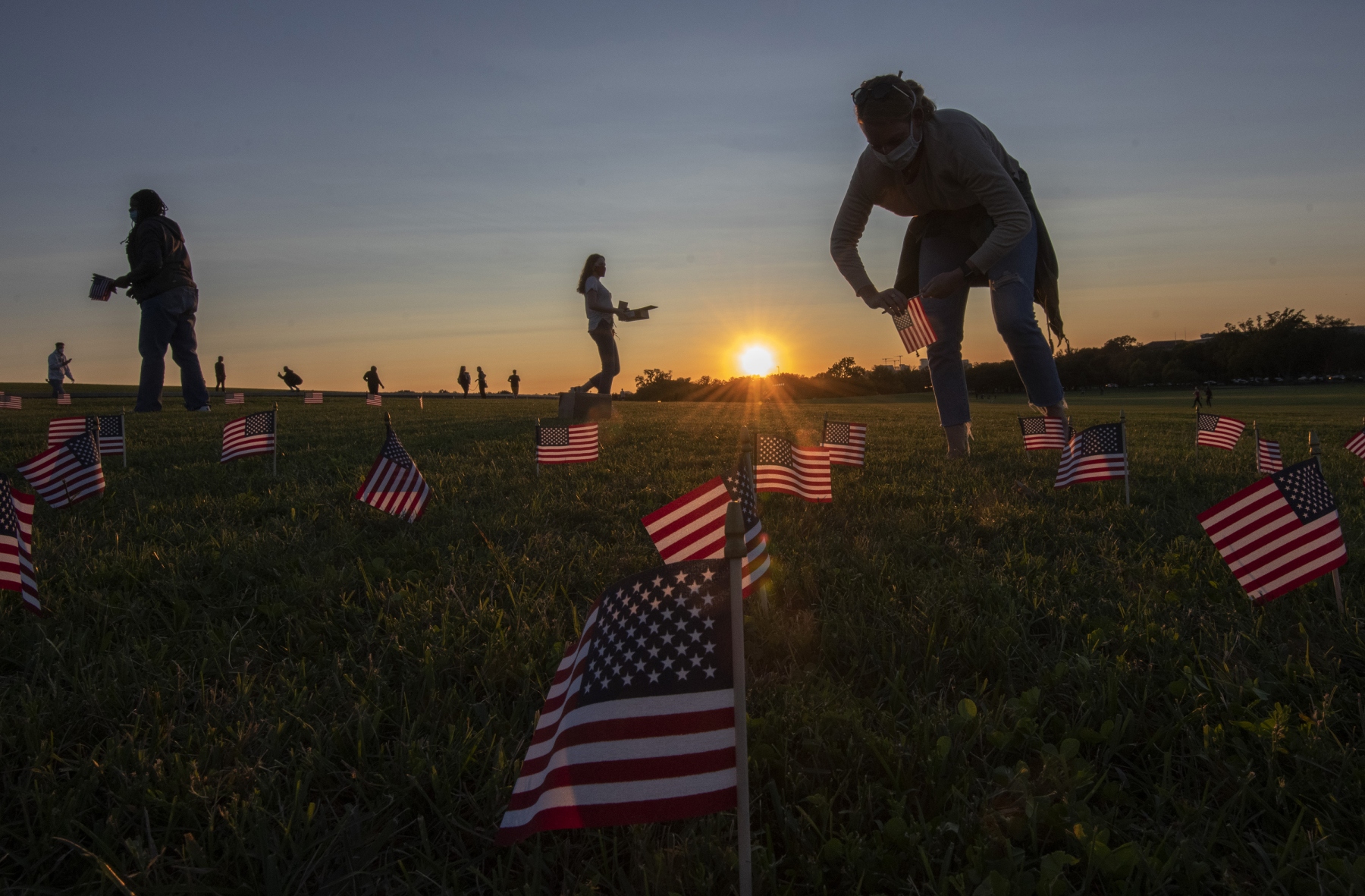 EXHIBIT AWARD - Patrick Benic – UPI – “Flags at Sunset for Covid Victim” - Covid Memorial Project volunteers plant 20,000 American flags at sunset on the National Mall to represent the 200,000 Americans who have died to this point in 2020 due to the Covid-19 pandemic, in Washington, DC, on Monday, September 21, 2020.