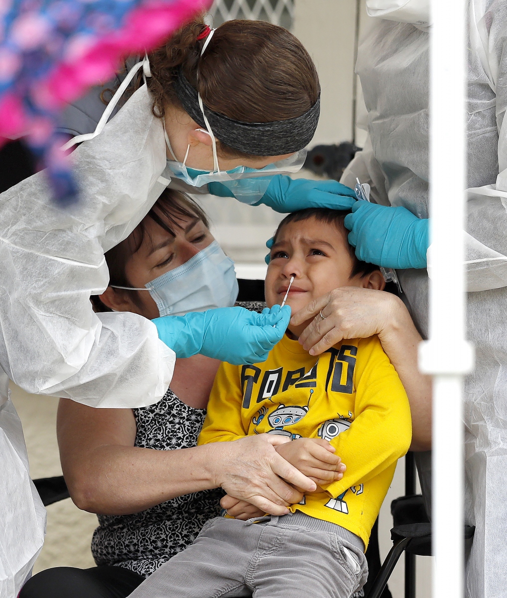 EXHIBIT AWARD - Julio Cortez – The Associated Press – “Scary Test” - Angel Landaverde, 4, is restrained by his aunt Vilma Landaverde, center left, and medical workers as a swab is placed in his nose during a coronavirus testing at a walk-up testing cite, Monday, April 20, 2020, in Annapolis, Md.