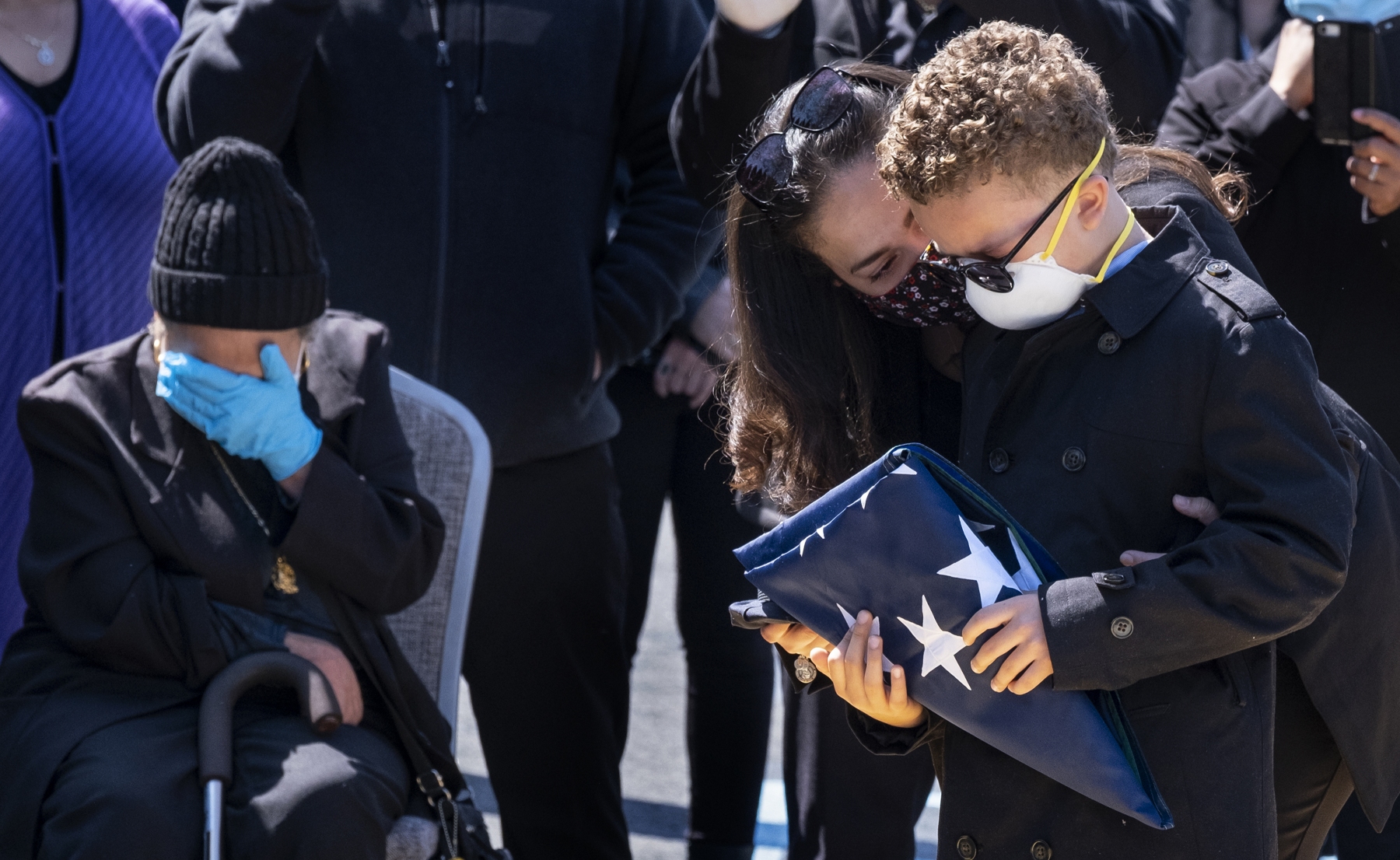 EXHIBIT AWARD - Craig Ruttle – Independent – “One of the Finest Lost” - Robert Cardona Jr., 9, holds the flag that covered the casket carrying his father, NYPD Detective Robert Cardona, of the 13th Precinct detective squad, after it was carried from the Sinatra Funeral Home Saturday, April 25, 2020. in Yonkers, N.Y., during a funeral service. According to NYPD Chief of Detectives Rodney Harrison, Detective Robert Cardona died April 15 from complications of COVID-19 (Coronavirus) after 19 years on the force.