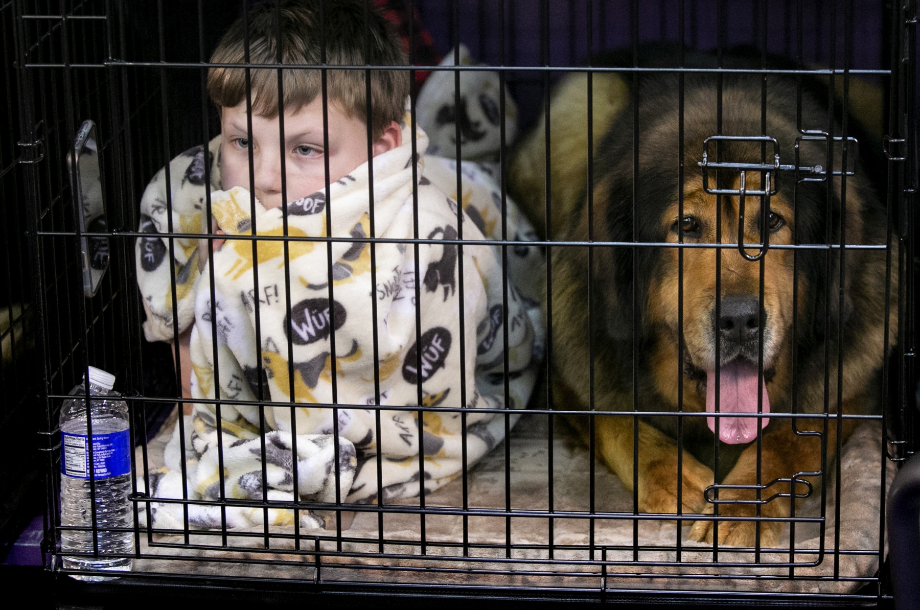 EXHIBIT AWARD - Aristide Economopoulos – NJ Advance Media – “In the Dog House” - Benjamin Osborne, 10, of New Milford, PA relaxes in a cage with Diamond a Tibetan Mastiff. The 2020 Westminster Dog Show held at Pier 94 in Manhattan. Tuesday, February 11, 2020. New York, NY USA