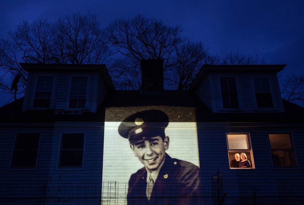 An image of veteran Charles Lowell is projected onto the home he shared with his wife, Alice, for 30 years as she stands at left with her daughter, Susan Kenney, in Hardwick, Mass. Saturday, May 2, 2020. Lowell, a U.S. Air Force veteran and resident of the Soldier’s Home in Holyoke, Mass., died from the COVID-19 virus at the age of 78. Seeking to capture moments of private mourning at a time of global isolation, the photographer used a projector to cast large images of veterans on to the homes as their loved ones are struggling to honor them during a lockdown that has sidelined many funeral traditions. David Goldman/Associated Press