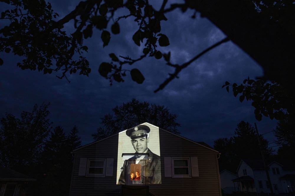 An image of veteran Charles Lowell is projected onto the home he shared with his wife, Alice, for 30 years as she stands at left with her daughter, Susan Kenney, in Hardwick, Mass. Saturday, May 2, 2020. Lowell, a U.S. Air Force veteran and resident of the Soldier’s Home in Holyoke, Mass., died from the COVID-19 virus at the age of 78. Seeking to capture moments of private mourning at a time of global isolation, the photographer used a projector to cast large images of veterans on to the homes as their loved ones are struggling to honor them during a lockdown that has sidelined many funeral traditions. David Goldman/Associated Press