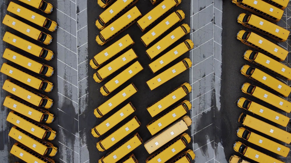 HONORABLE MENTION - David Goldman – The Associated Press – “The Spaces We Filled Now Filled With Space” - School buses sit parked in a lot as schools remain closed due to the coronavirus Monday, March 30, 2020, in Providence, R.I. From above, life on earth looks different. The patterns of our daily routines is now replaced by the patterns of school buses sitting idle.