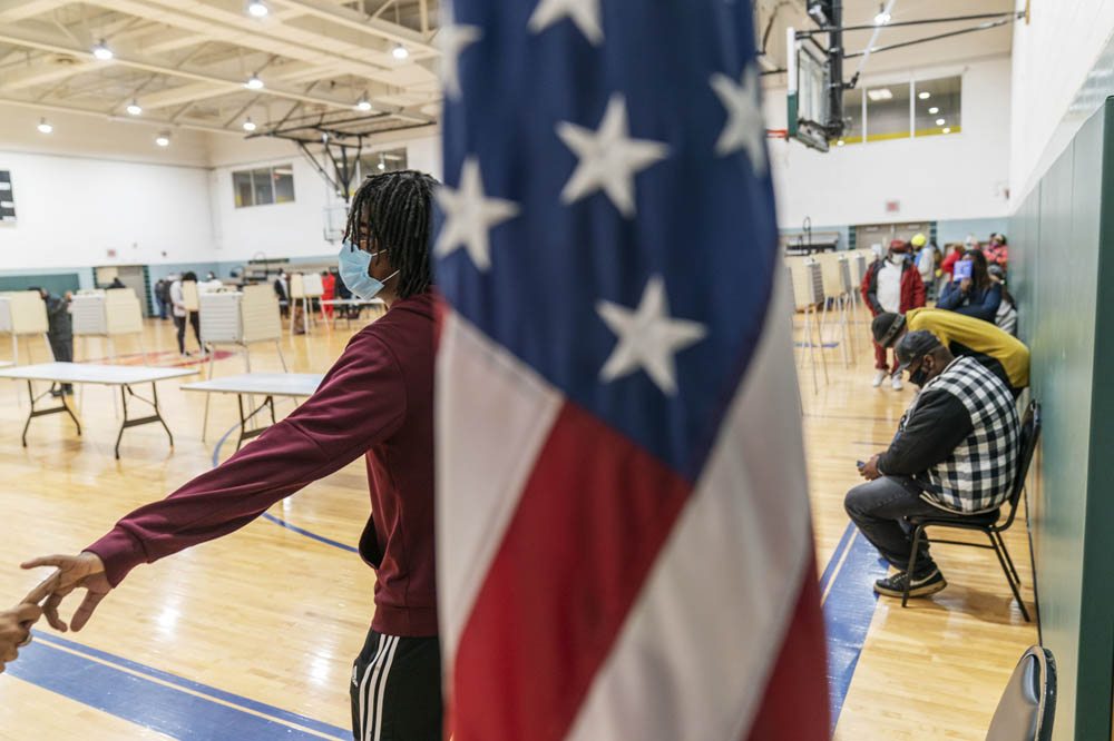 HONORABLE MENTION - David Goldman – The Associated Press – “Swing State Election” - Moe Jackson holds the hand of his girlfriend, Gabrielle McCoy, left, while waiting in line to fill out a ballot on the last day of early absentee voting before tomorrow’s general election at the Northwest Activities Center in Detroit, Monday, Nov. 2, 2020.