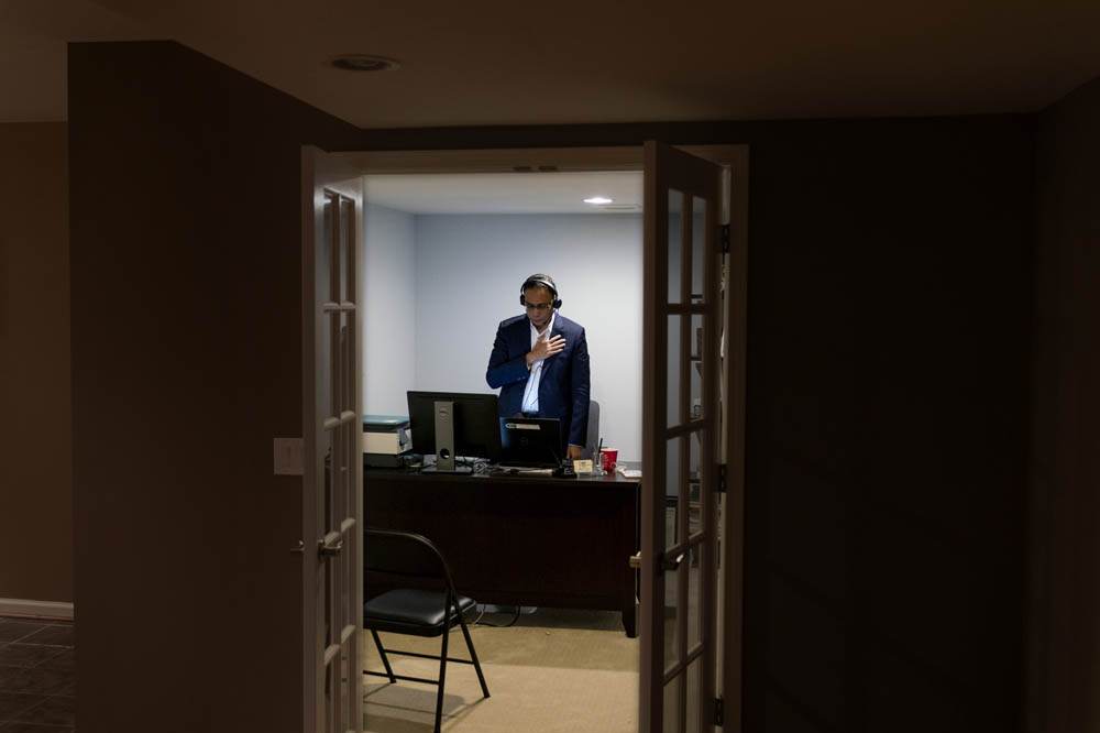 HONORABLE MENTION - David Goldman – The Associated Press – “Swing State Election” - Shahin Nazmul Hassan, founder of the Bangladeshi American Democratic Caucus in Michigan, stands for the National Anthem while conducting a virtual rally with voters and local politicians from his home in Sterling Heights, Mich., Thursday, Oct. 29, 2020. “Thirty years ago, when I came to this country, it was so beautiful, so warm and welcoming, so accepting. But that is not the culture anymore,” he said. “What we’ve seen in the past four years is division, putting people down. There’s no decency and respect.”