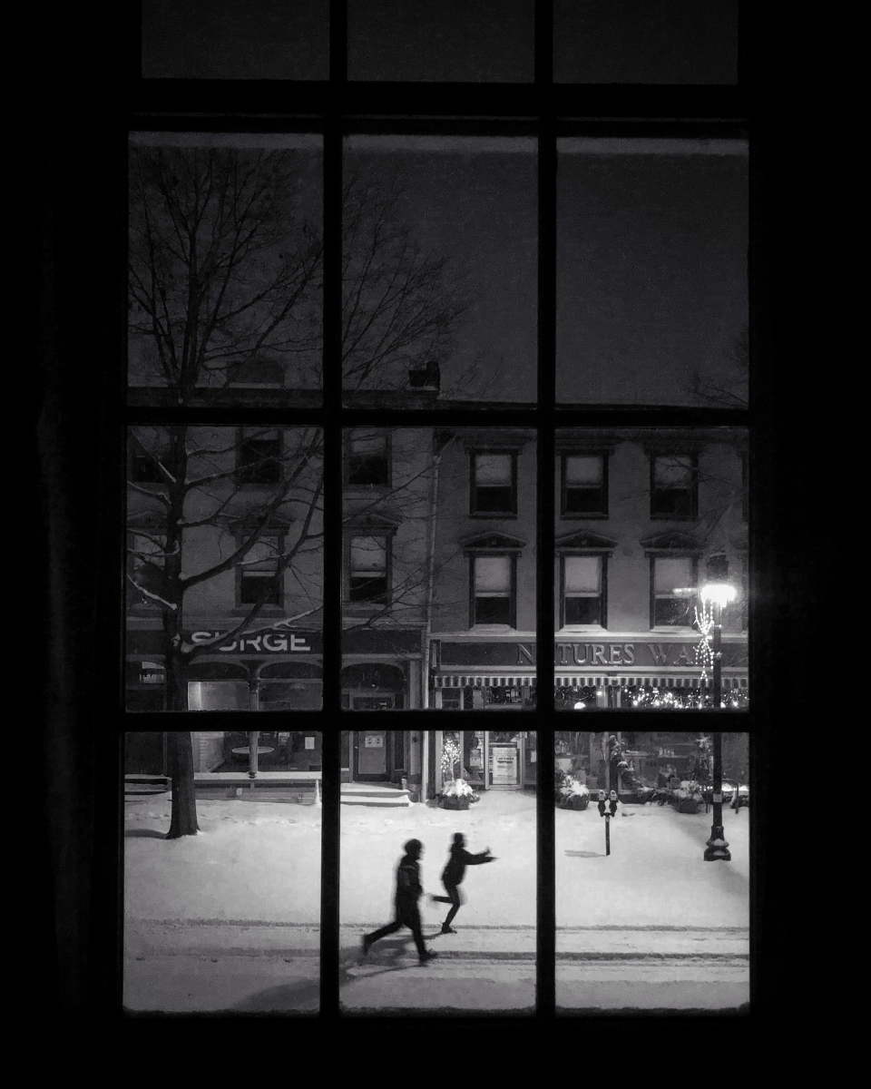EXHIBIT AWARD - Saed Hindash – NJ Advance Media – “Window Scene” - People race down Northampton Street after nightfall in Easton as a nor'easter pummels the Lehigh Valley on Dec. 16, 2020.
