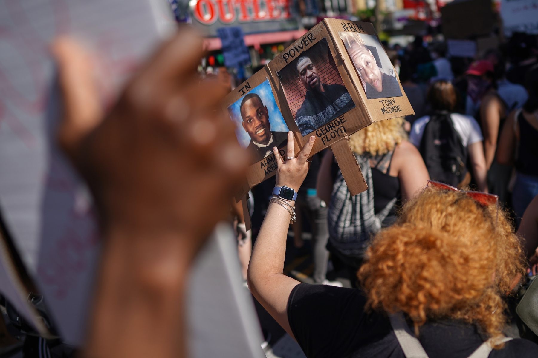 A lone fist, representing the sentiments of many of the people of NYC, is held high during the memorial service for George Floyd, whose death in police custody in Minneapolis sparked nationwide protests and riots, will take place in Brooklyn Thursday June 4, 2020. J. Conrad Williams Jr. /Newsday