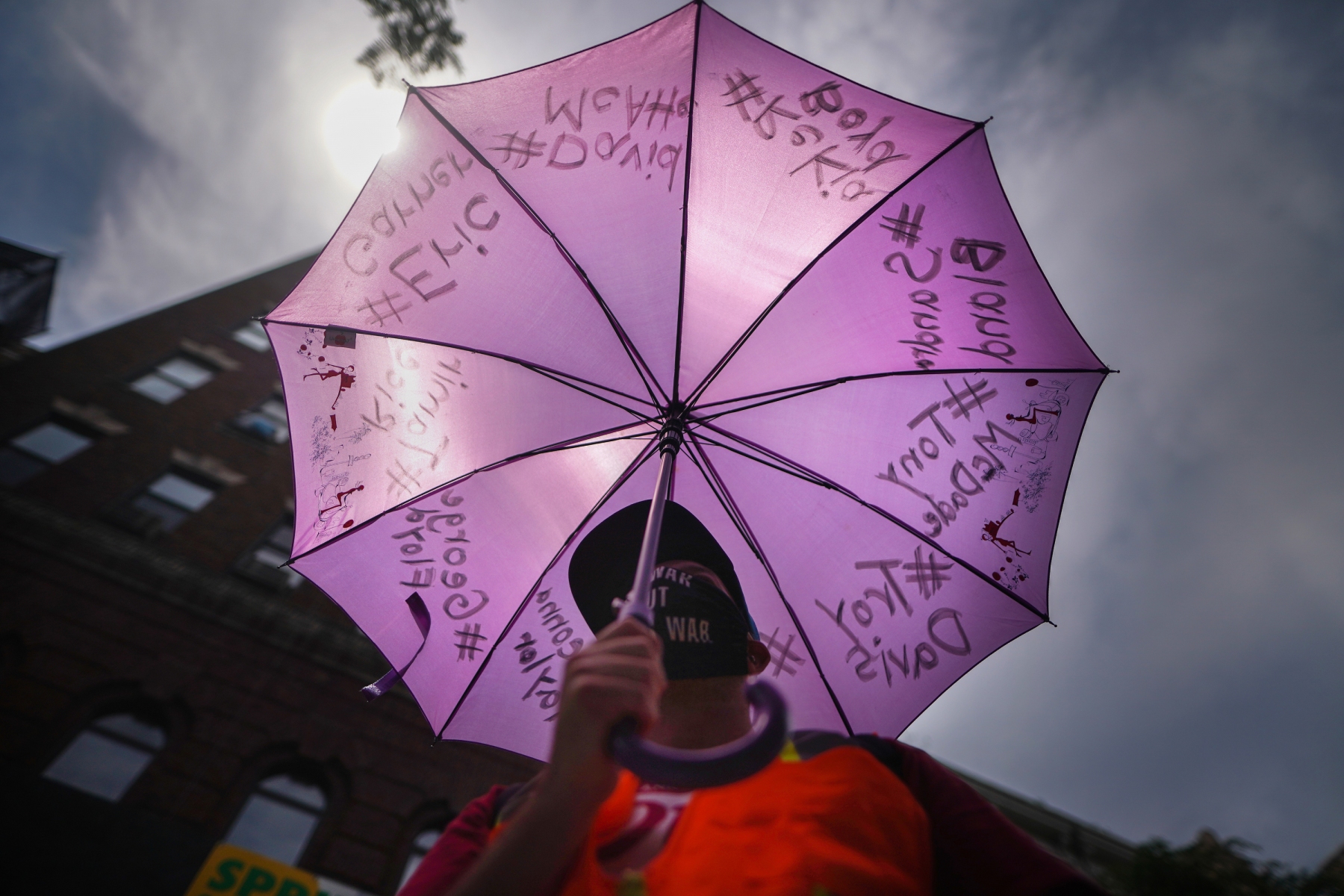 HONORABLE MENTION - Chang W. Lee – The New York Times – “George Floyd Protests” - Frankie Cook, holding an umbrella written with the names of police brutality, protested in front of the building of New York City Council Speaker Corey Johnson’s house on E. 15th St after they rallied at Union Square Park demanding defund police for police brutality and use the money for education and school in New York, NY, on June 27th, 2020.