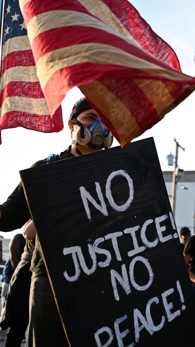 HONORABLE MENTION - Steven Pfost – Newsday – “Long Island March for Racial Justice” - 'Aleki Lui, of Riverhead, holds a sign and flag during a protest for Justice for Jacob Blake in Merrick, Wednesday, Aug. 26, 2020.
