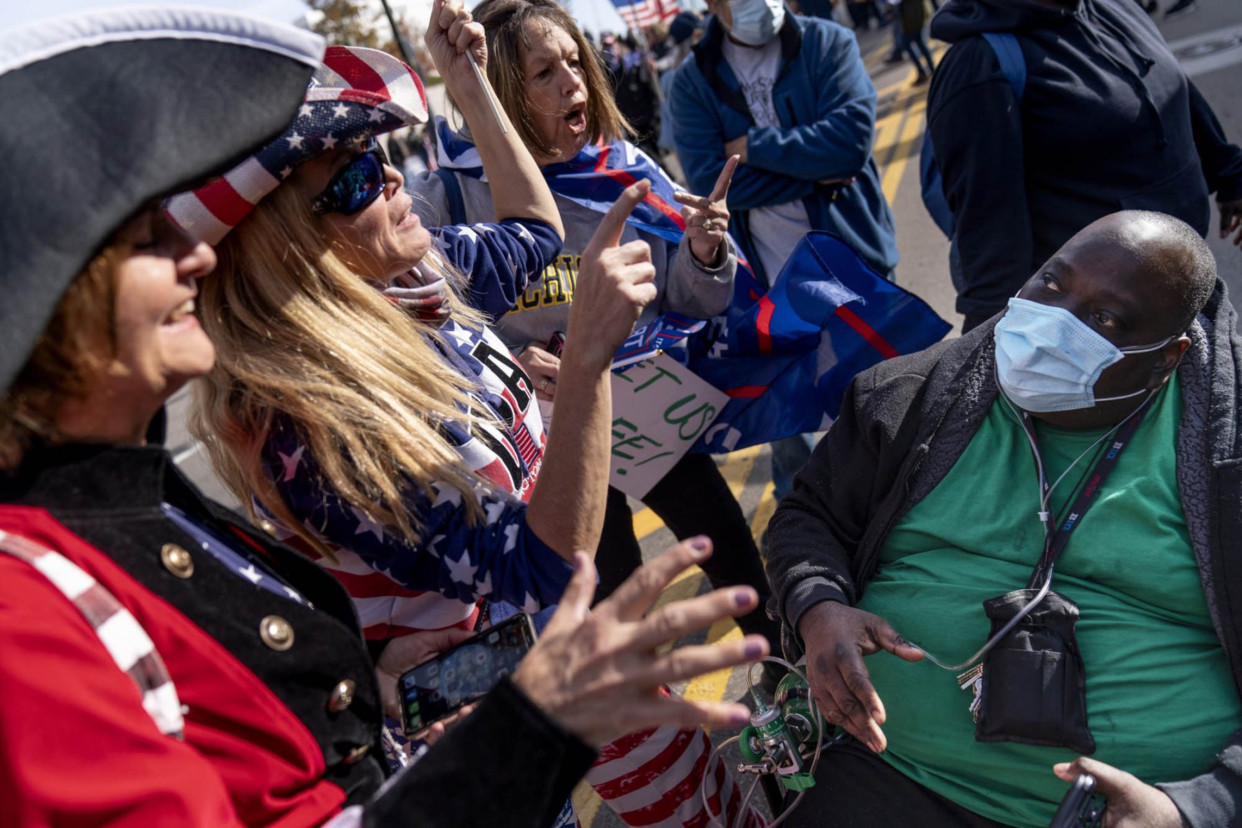 A Biden supporter who would only give his first name, Douglas, right, engages in a debate with Trump supporters demonstrating against the election results outside the central counting board at the tcf Center in Detroit, Friday, Nov. 6, 2020.