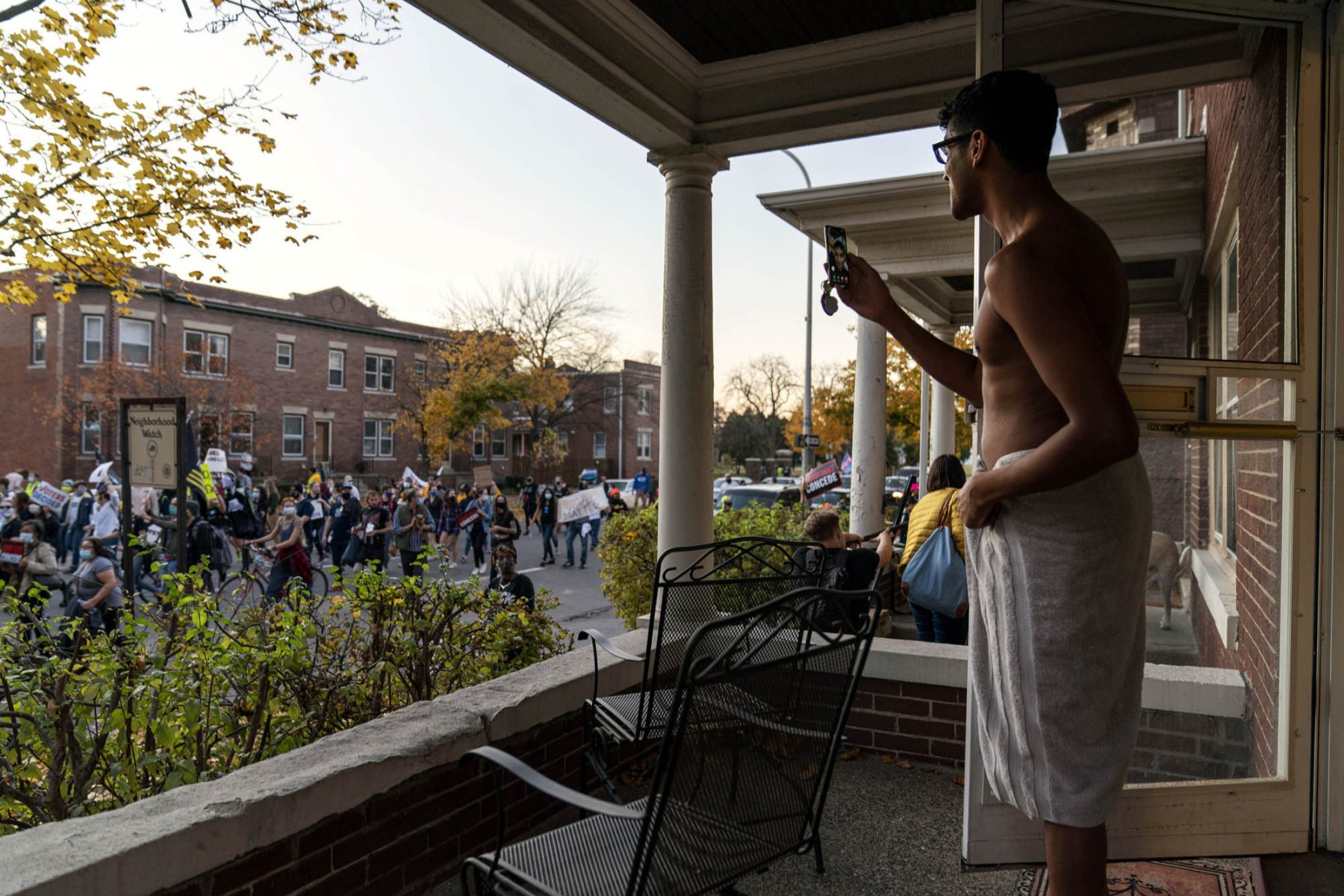 Karthik Mantha comes out his front door in a towel just as he was about to step in shower to watch a march pass by celebrating the announcement that President Donald Trump lost the election in Detroit, Saturday, Nov. 7, 2020.