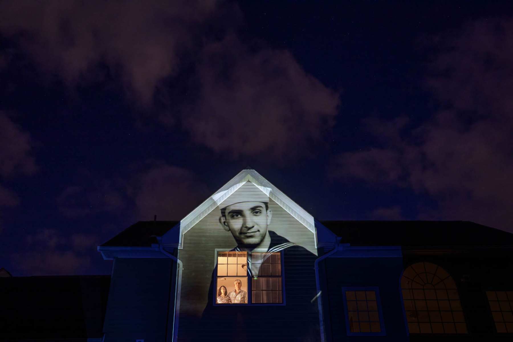 An image of veteran Charles Lowell is projected onto the home he shared with his wife, Alice, for 30 years as she stands at left with her daughter, Susan Kenney, in Hardwick, Mass. Saturday, May 2, 2020. Lowell, a U.S. Air Force veteran and resident of the Soldier’s Home in Holyoke, Mass., died from the COVID-19 virus at the age of 78. Seeking to capture moments of private mourning at a time of global isolation, the photographer used a projector to cast large images of veterans on to the homes as their loved ones are struggling to honor them during a lockdown that has sidelined many funeral traditions. David Goldman/Associated Press
