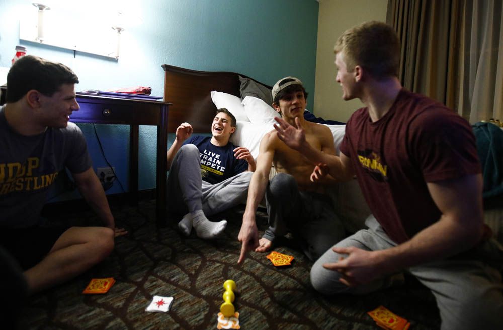 2ND PLACE - Saed Hindash – NJ Advance Media – “Two-time champion” - Andrew Cerniglia, center, reacts as he plays Jungle Speed with his teammates Jason Sine, left, Brett Ungar, and Ryan Crookham, far right, the night before the first round of the 2020 Class 2A PIAA individual championships.