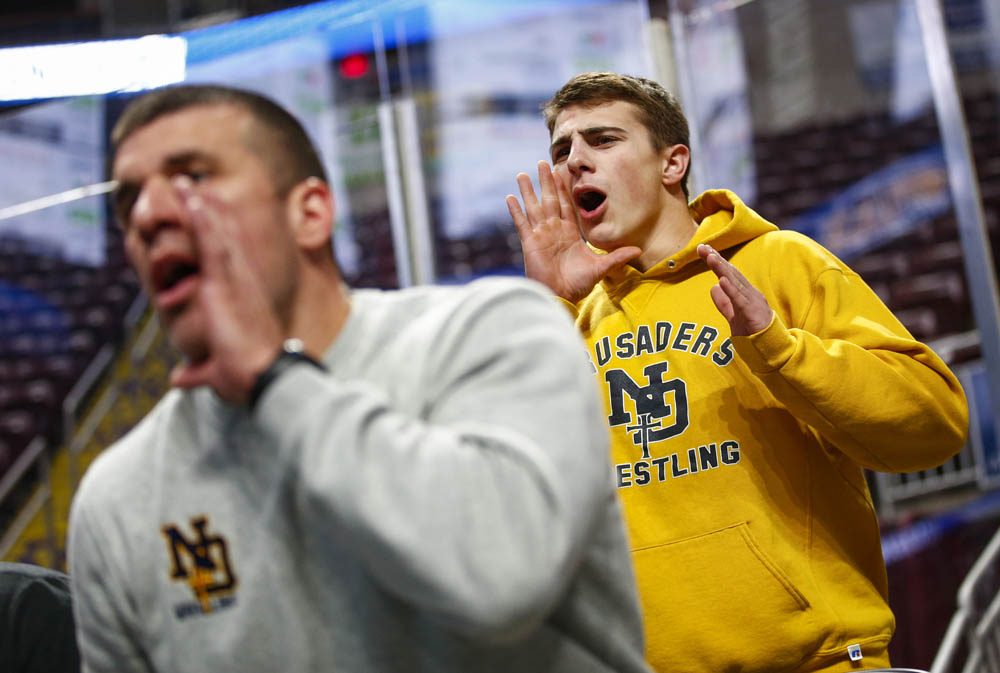 2ND PLACE - Saed Hindash – NJ Advance Media – “Two-time champion” - When he isn't competing, you can often find Andrew Cerniglia helping his coaches direct fellow wrestlers during their bouts. Here he is shouting to a teammate during the second round consolations of the PIAA Class 2A team wrestling championships on Feb. 7, 2020.