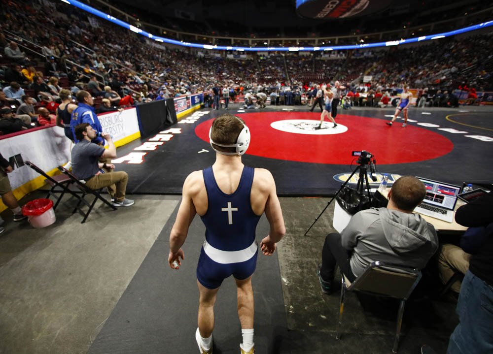 2ND PLACE - Saed Hindash – NJ Advance Media – “Two-time champion” - Andrew Cerniglia heads to the mat to take on Phillipsburg-Osceola's Hunter Weitoish at 160 pounds during the PIAA 2A individual tournament quarterfinals on March 6, 2020.