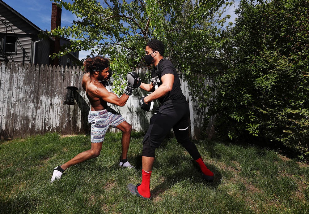 HONORABLE MENTION - Al Bello – Getty Images – “Local Amateur Boxers Continue to Train During Pandemic” - Khamall Dunkley (L) hits the mitts with his training partner Chris Hinds on May 20, 2020 in Freeport New York. Khamall is an amateur boxer who fought in the New York City Golden Gloves and made the quarter finals in the Novice 141 lbs class. He was training to compete in this year's Golden Gloves in the Open Class, but the tournament was cancelled due to the coronavirus pandemic. The gym he fights for, the Freeport Boxing Club, has been closed since March 16. Until gyms are deemed safe to open, he continues to train at home with the hope that he can box again later this year.
