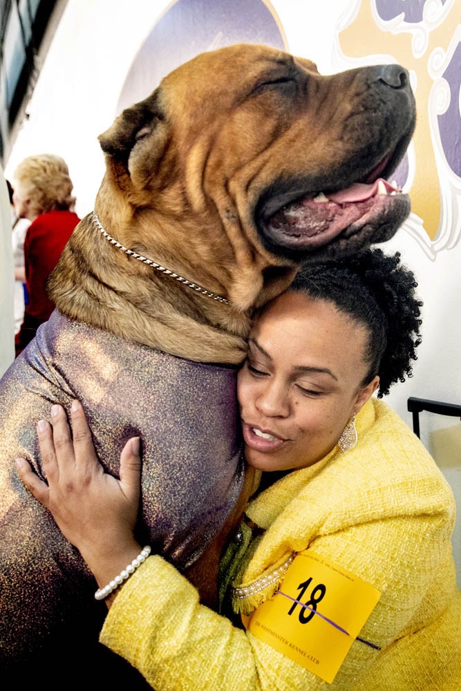 HONORABLE MENTION - Aristide Economopoulos – NJ Advance Media – “2020 Westminster Dog Show” - While next to a ring waiting to compete, handler/owner Vickie Venzen, of Abington, MD, gets a big hug from Kongo who is a Cane Corso breed. The 2020 Westminster Dog Show held at Pier 94 in Manhattan. Tuesday, February 11, 2020. New York, NY USA