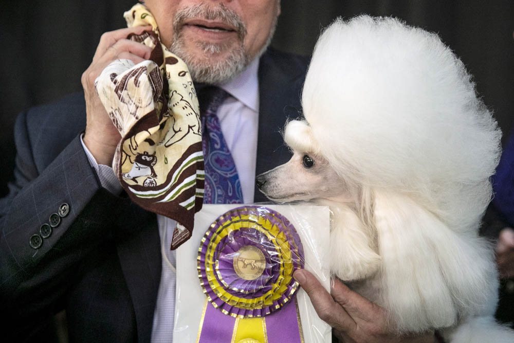 HONORABLE MENTION - Aristide Economopoulos – NJ Advance Media – “2020 Westminster Dog Show” - Handler Smash Copeland, from Japan, wipes the sweet of his face after winning Best of Breed with the Toy Poodle Camp. The 2020 Westminster Dog Show held at Pier 94 in Manhattan. Monday, February 10, 2020. New York, NY USA