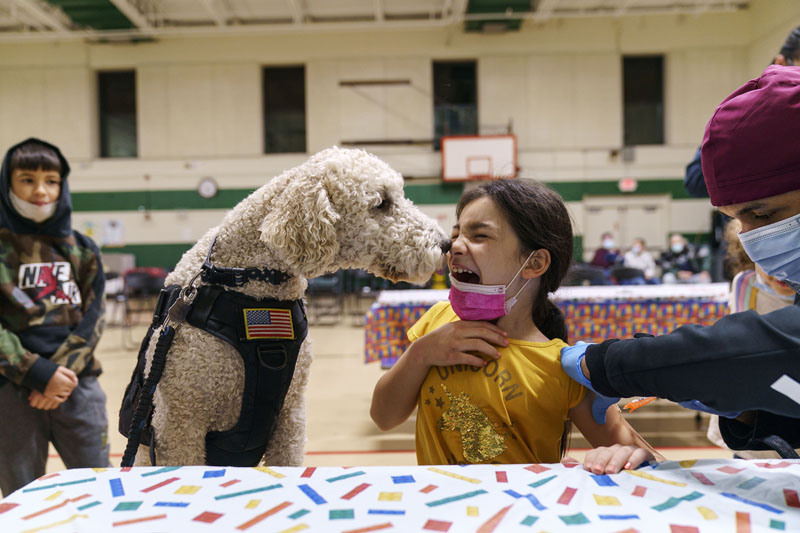Leanna Arcila, 7, is licked by Watson, a therapy dog with the Pawtucket police department, as she receives her COVID-19 vaccination from Dr. Eugenio Fernandez at Nathanael Greene Elementary School in Pawtucket, R.I., Tuesday, Dec. 7, 2021. Even as the U.S. reaches a COVID-19 milestone of roughly 200 million fully-vaccinated people, infections and hospitalizations are spiking, including in highly-vaccinated pockets of the country like New England.