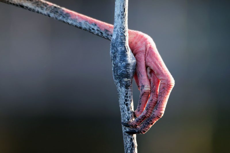 A close-up view of the foot and leg of a wood stork in the Wakodahatchee Wetlands on February 19, 2021 in Delray Beach, Florida